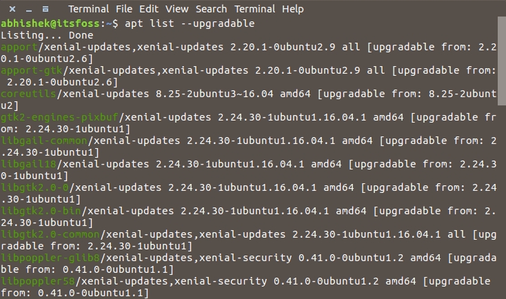 列出可更新的软件包及版本信息:apt list --upgradeable