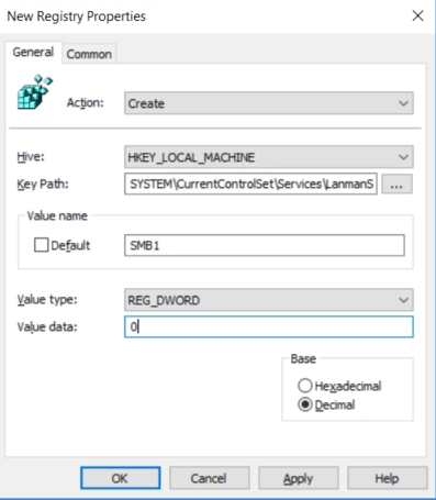 HKEY_LOCAL_MACHINE\SYSTEM\CurrentControlSet\Services\LanmanServer\Parameters 注册表项: SMB1 REG_DWORD: 0 = Disabled