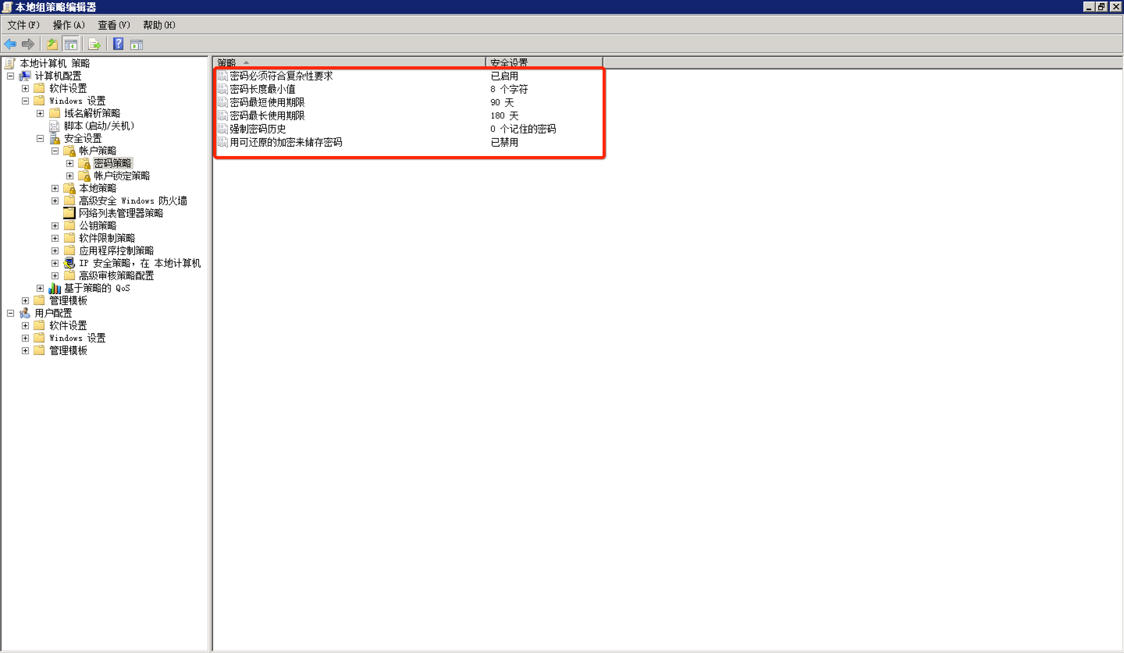 操作步骤打开 控制面板 > 管理工具 > 本地安全策略,在 帐户策略 > 密码策略 中,配置 密码最长使用期限 不大于90天。