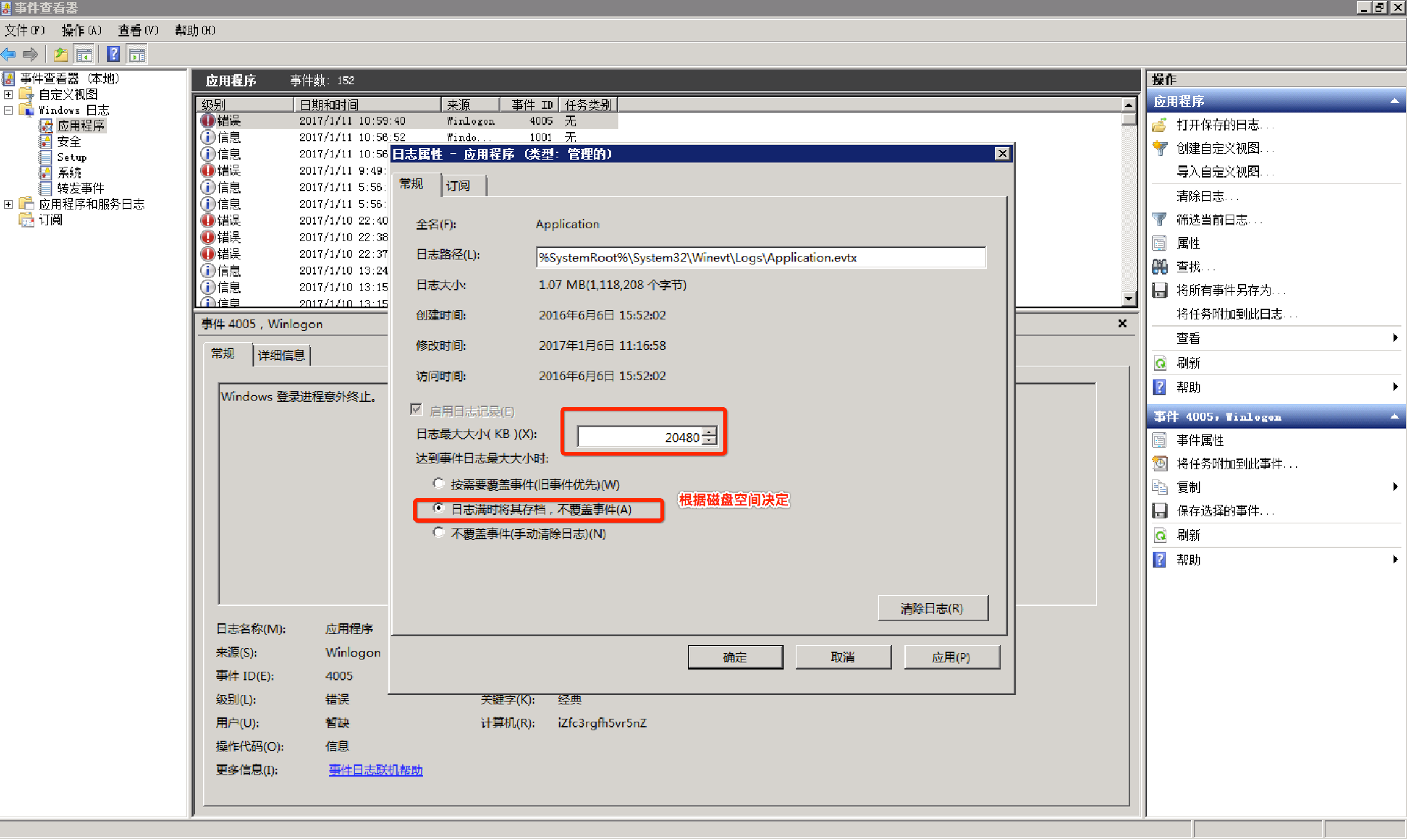 打开 控制面板 > 管理工具 > 事件查看器,配置应用日志、系统日志、安全日志属性中的日志大小,以及设置当达到最大的日志尺寸时的相应策略。