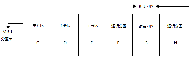 这是采用MBR分区方案的硬盘分区示意图,关于主分区、扩展分区与逻辑分区的各自含义,后面会有说明。